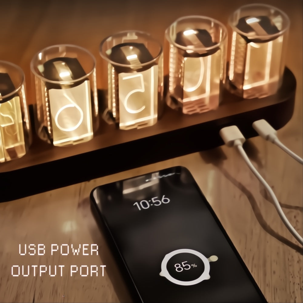 Elevate your home or office decor with this stunning RGB LED Clock, designed with a modern twist to classic timekeeping. The Rainbow Time RGB LED Clock combines technology and style, making it a perfect addition to any setting. The sleek wooden base and transparent cylindrical display tubes give it a unique aesthetic appeal, blending seamlessly with contemporary interiors. The clock features a vivid RGB LED display that brings your time-telling experience to life with dynamic colors and adjustable brightness. It's more than just a clock; it's a statement piece.
